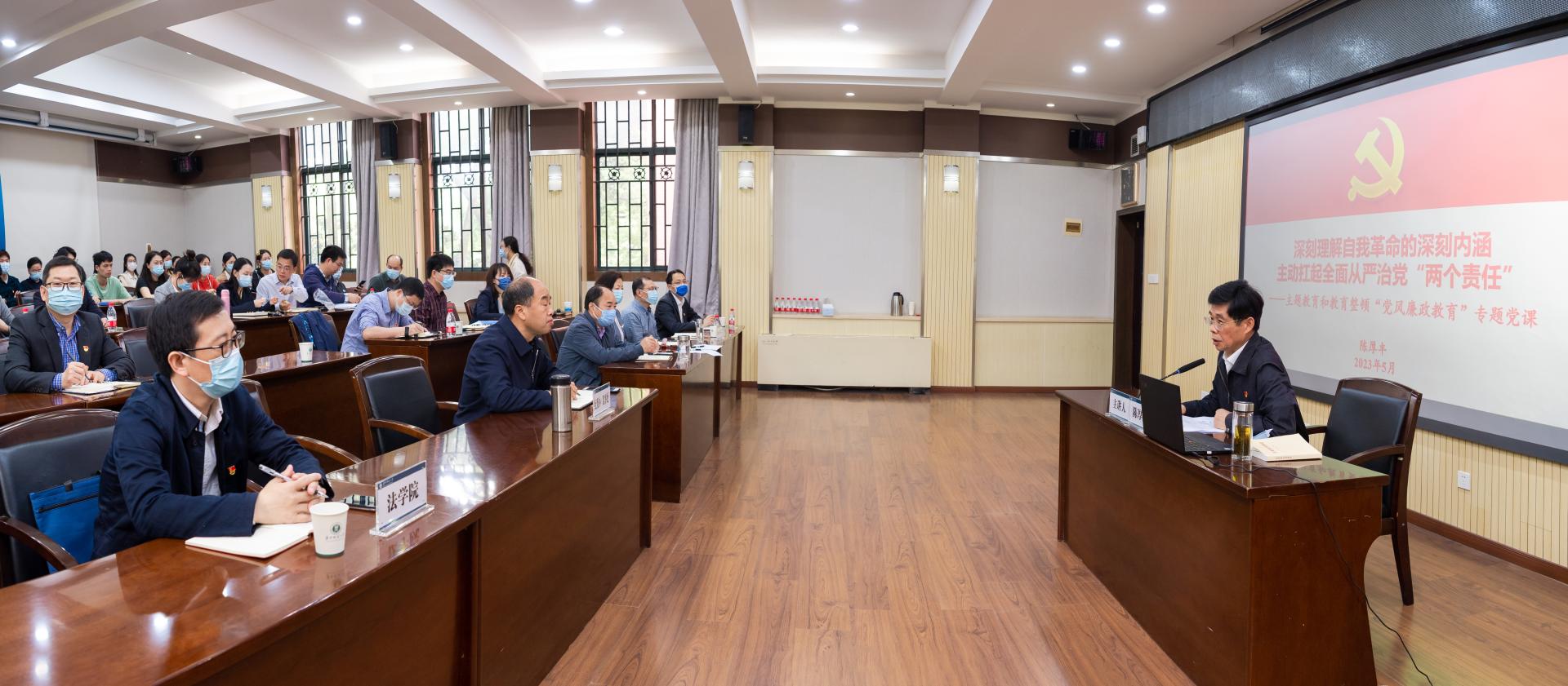 (通讯员 赵娜)5月11日上午,校党委副书记、纪委书记陈厚丰在行政楼二楼会议室为纪委办(监察处)、巡察办全体干部、二级纪委专兼职纪检干部、联系单位的党政负责人、党员教师和学生代表讲授学习贯彻习近平新时代中国特色社会主义思想主题教育暨纪检监察干部队伍教育整顿党课。