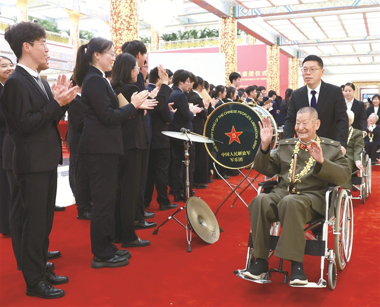 “共和国勋章”获得者黄宗德17岁入伍投身革命,在渡江战役、江西剿匪、抗美援朝战争中冲锋在前、屡立战功。在颁授仪式上,93岁的黄宗德被搀扶起身:“千千万万的革命英烈,他们为了民族独立、国家富强,牺牲了自己的宝贵生命。今天这份崇高的荣誉同样属于他们。”
