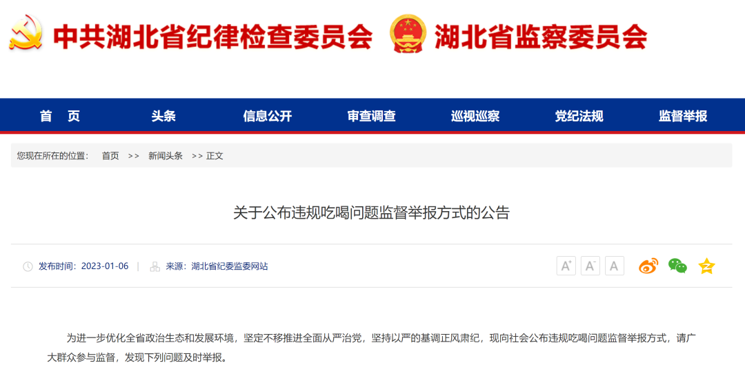1月初,湖北省纪委监委发布《关于公布违规吃喝问题监督举报方式的公告》,向社会公布违规吃喝问题监督举报方式,请广大群众参与监督。