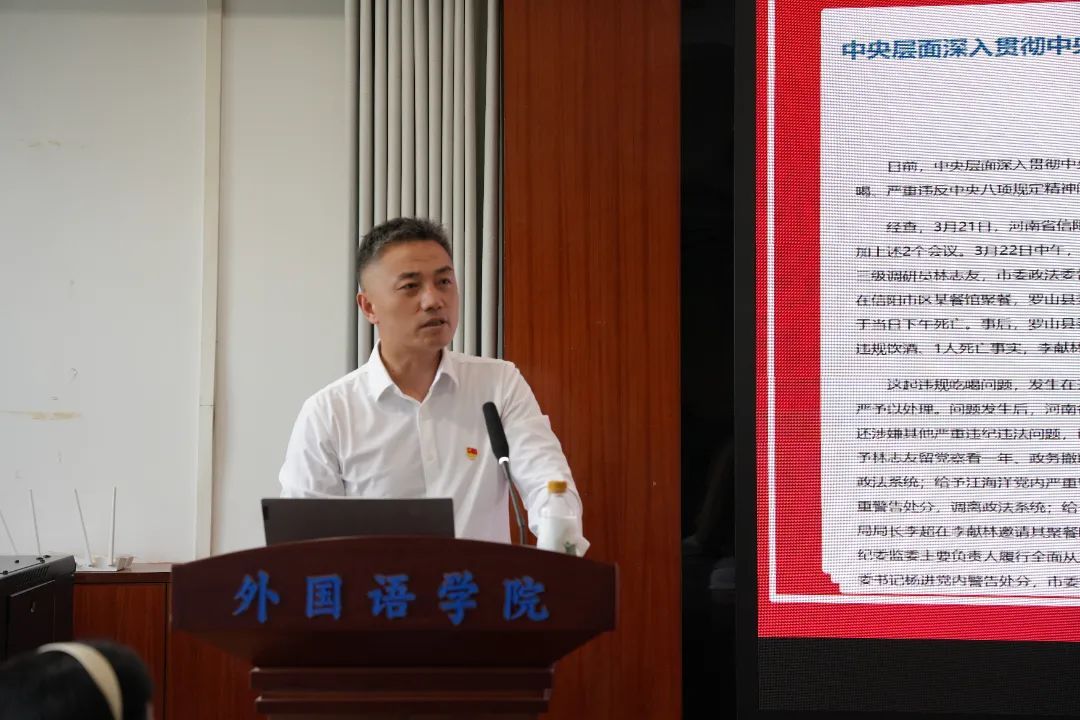 5月28日,为深入贯彻中央八项规定精神,外国语学院党委召开理论学习中心组(扩大)学习会,邀请学校纪委副书记兼纪委办公室主任、监察处处长杨青松作了题为《持续筑牢中央八项规定堤坝,以优良作风护航学校“双一流”建设》的专题辅导报告,学院党委书记麻旎主持会议,学院党政领导班子、理论学习中心组成员、全院教职工和学生党员代表参加集体学习。