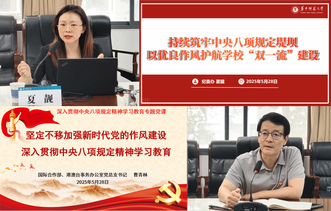 5月28日下午,国际合作部、港澳台事务办公室于310会议室举办深入贯彻中央八项规定精神学习教育专题报告会。会议邀请学校中央八项规定及其实施细则精神宣讲团成员、纪委办夏靓老师作报告。国际合作部、港澳台事务办公室全体党员、干部参加会议,党总支书记曹青林主持会议。