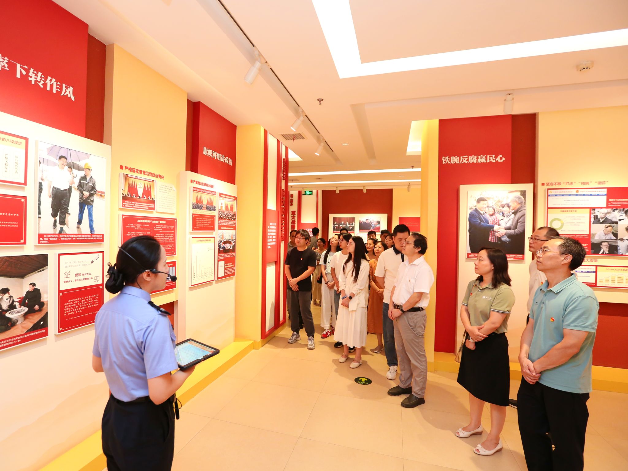 在基地讲解员的引导下,师生党员参观了“赶考之路”“廉政之规”“覆车之鉴”“湖北之为”四个主题展厅。“赶考之路”展厅通过历史图片和文献资料,回顾了中国共产党从建党到执政的奋斗历程,强调了永葆初心、勇于自我革命的重要性。“廉政之规”展厅系统展示了党的纪律规矩和法律法规,师生党员认真学习了中央八项规定及实施细则,体会到全面从严治党的制度保障。“覆车之鉴”展厅,陈列了多名落马官员的入党申请书,这些曾经满怀理想的誓言与如今的腐败事实形成鲜明对比。“湖北之为”展厅聚焦湖北省的反腐成就,展示了近年来查处的典型案例和取得的成效。