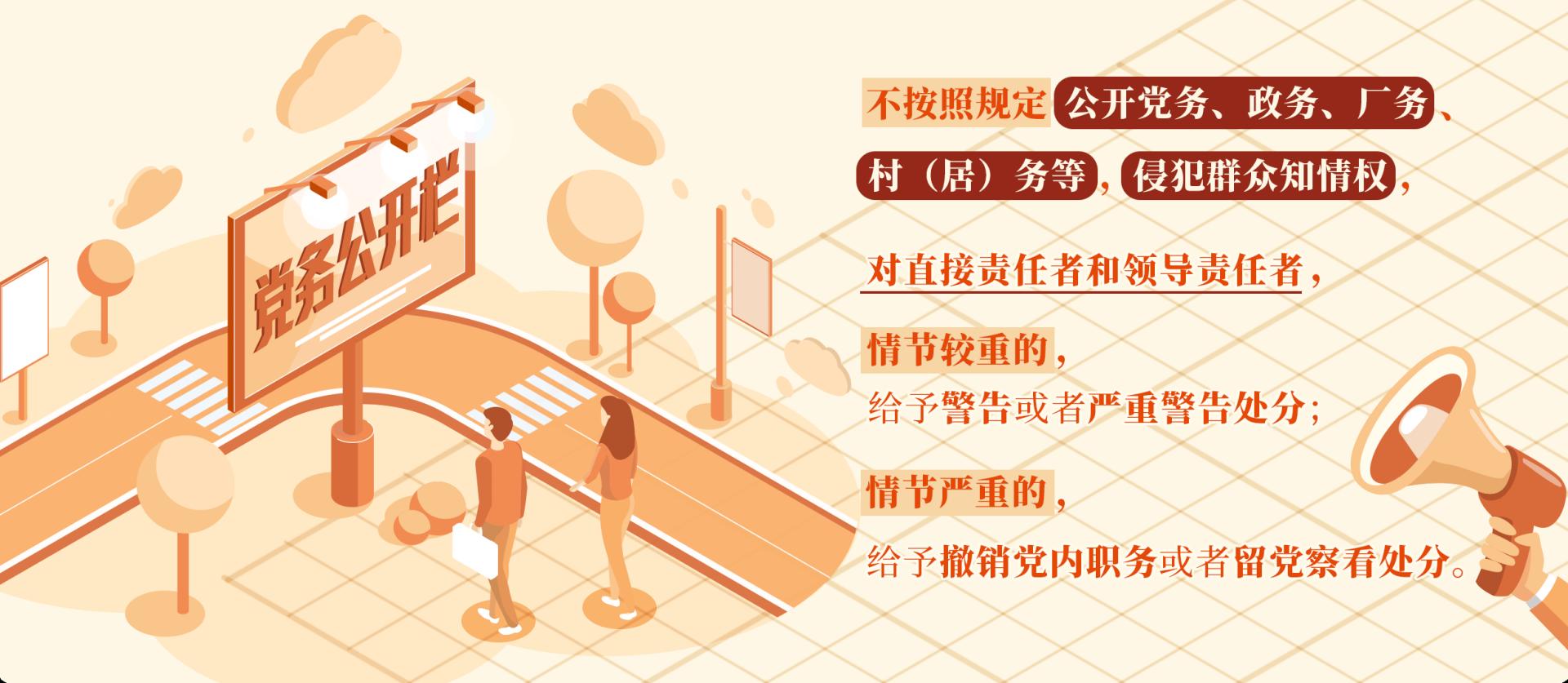 《中国共产党党务公开条例(试行)》《关于在国有企业、集体企业及其控股企业深入实行厂务公开制度的通知》《关于健全和完善村务公开和民主管理制度的意见》《关于全面推进政务公开工作的意见》等规定,对党务、政务、厂务、村(居)务等事务公开的内容、范围、程序等事项作了详细规范。党员、干部要按照规定做好党务、政务、厂务、村(居)务等事务公开,把权力放在阳光之下,置于群众监督之中,保障群众的知情权、监督权,切实维护群众利益。